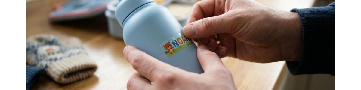 Hos Babadut.dk kan navneklistermærker designes med farver, skrifttyper og motiver, så barnet kan være med til at vælge. Det gør overraskende meget for, om barnet selv gider kigge efter sit mærke i en kurv fyldt med ens drikkedunke. Et eksempel på sortimentet er ark med 48 mærker i en størrelse, der passer godt til dunke og madkasser (babadut.dk).