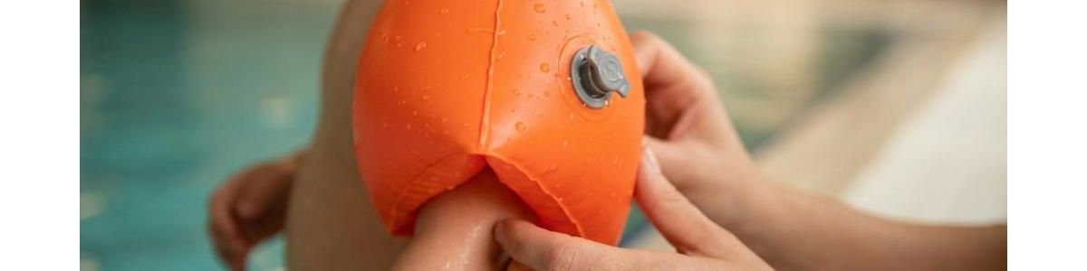 Hvis du vælger oppustelige vinger, så kig efter to luftkamre og solide ventiler. Og brug kræfter på pasformen: vingerne skal sidde på overarmen, så de ikke ruller ned mod albuen, når barnet plasker.